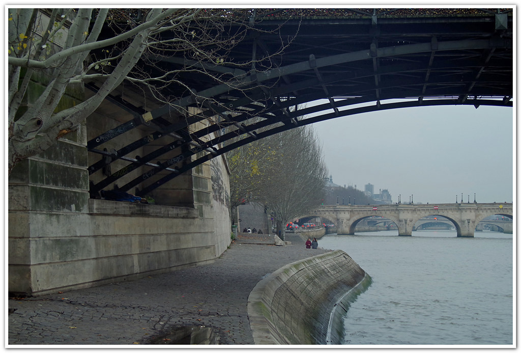 Maintenant que tu en parle, je ne vois plus que les lumières rouges  :P Je n'avais même pas remarqué les 4 ponts, l'arrière plan se fondant dans la brume. J'ai été attiré l'arbre au premier plan, la courbe du pont en haut, où l'on devine les innombrables cadenas d'amour, et celle des quais en bas, avec l'ambiance générale très douce.